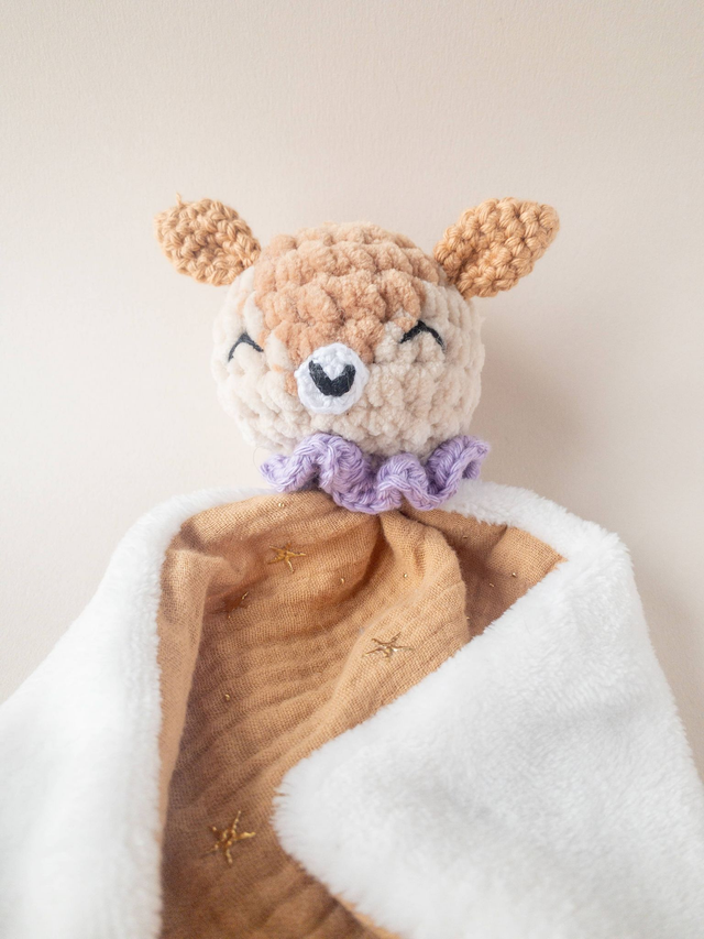 La tête de faon est réalisée au crochet et le corps du doudou y est cousu solidement.