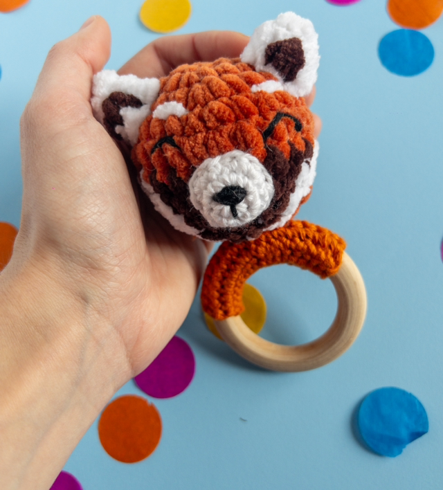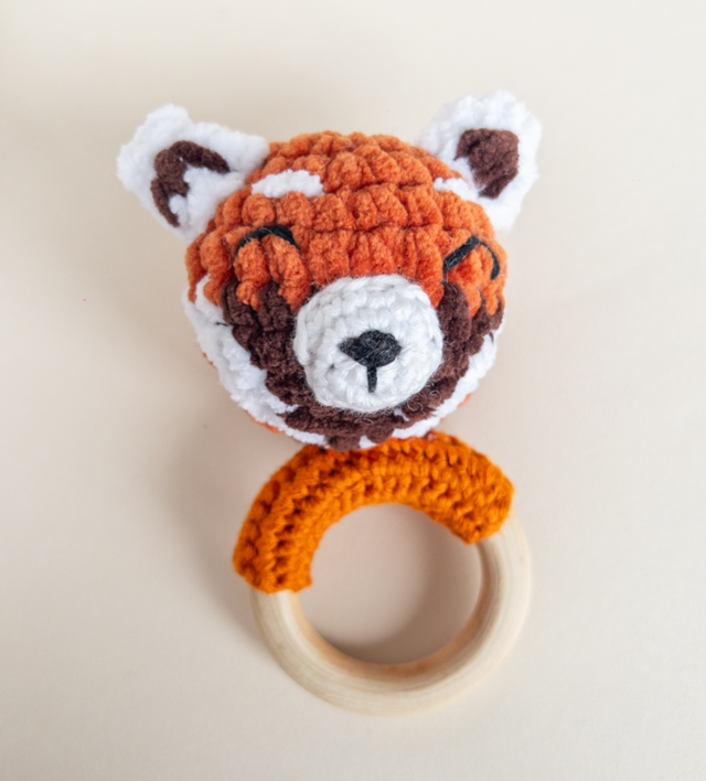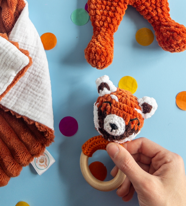 Ce joli hochet panda roux bimatière est adapté à la main de bébé et fait du bruit lorsqu'on le secoue pour lui permettre de développer ses sens et sa motricité.