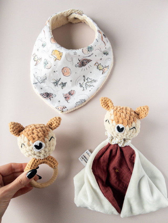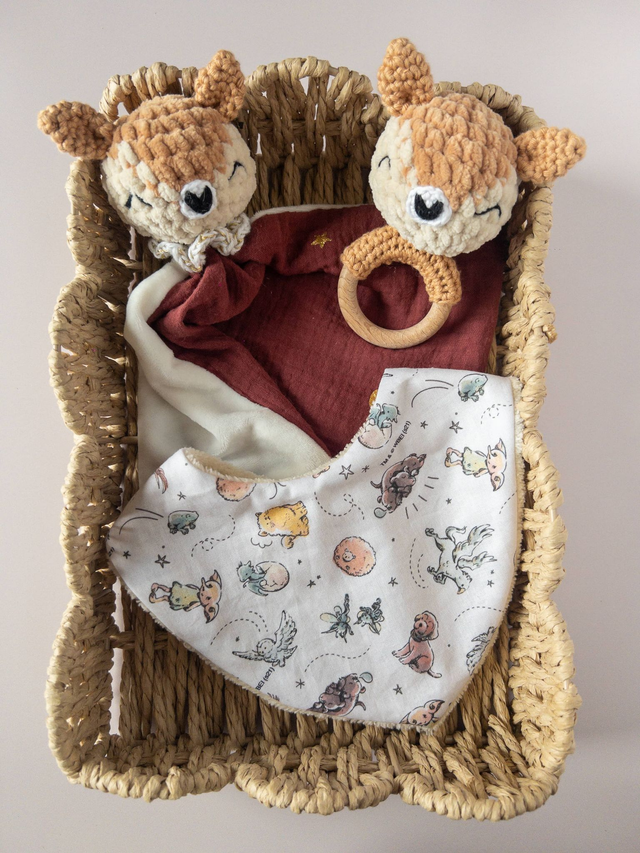- Un doudou Faon avec sa collerette magique (coton phosphorescent et fils doré).