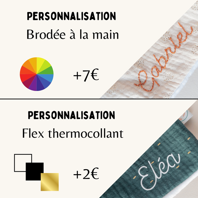 - Choix de la couleur du tissus éponge du bavoir (beige ou bleu).